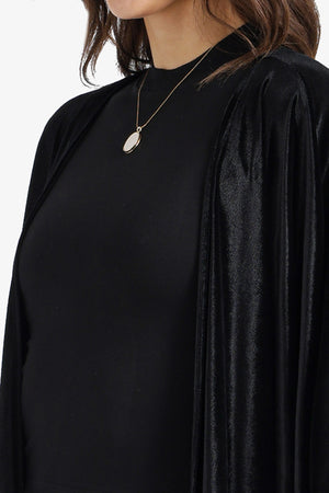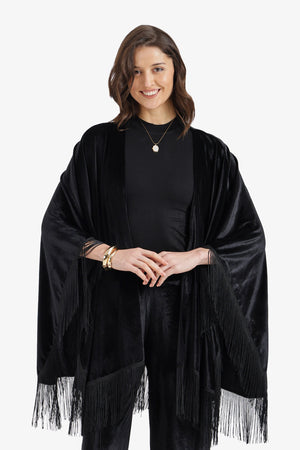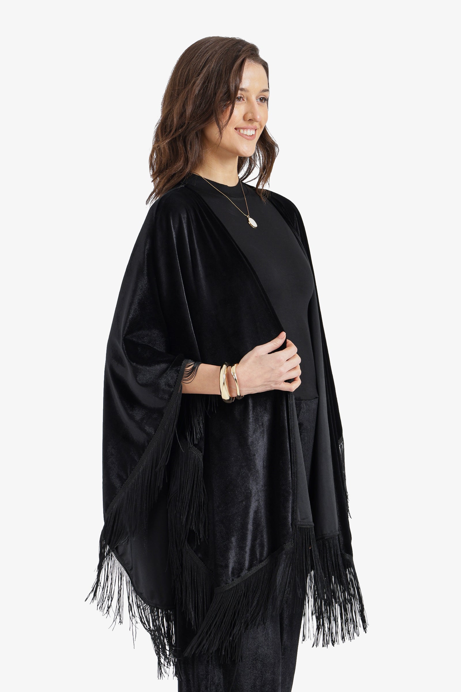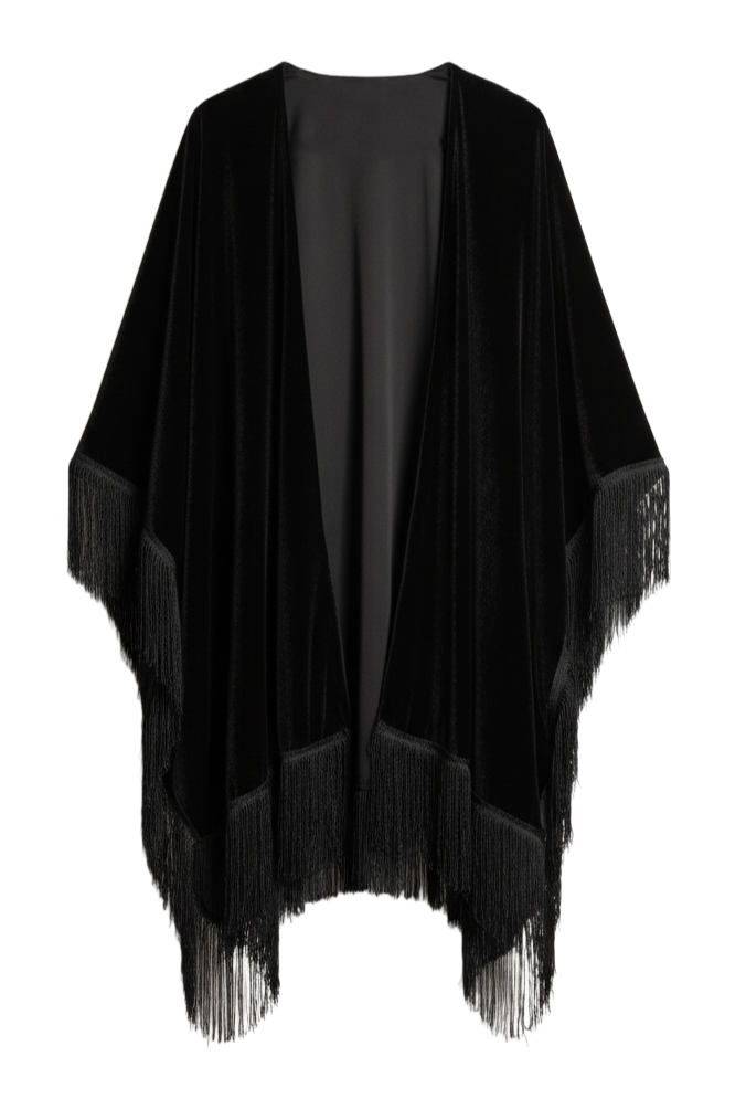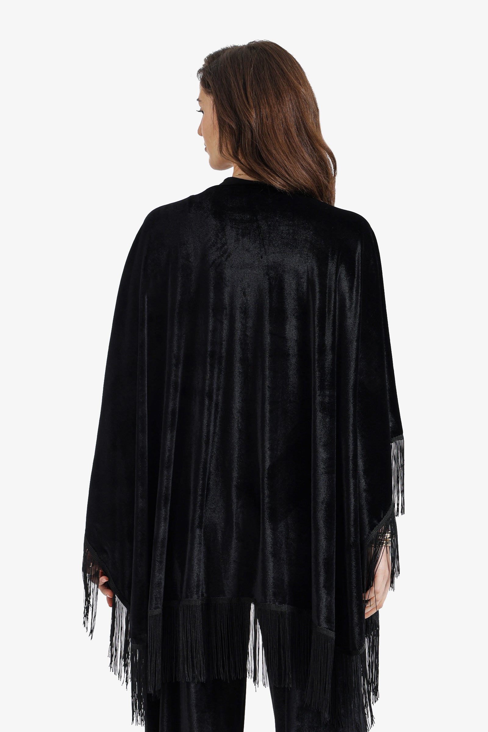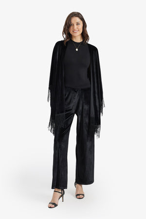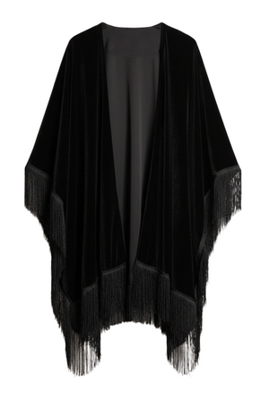 - Details: Relaxed fit, flowing velvet, delicate fringe detailing