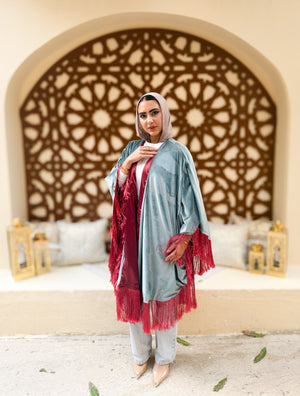 Fringed velvet satin cape - Mint x Dark Red