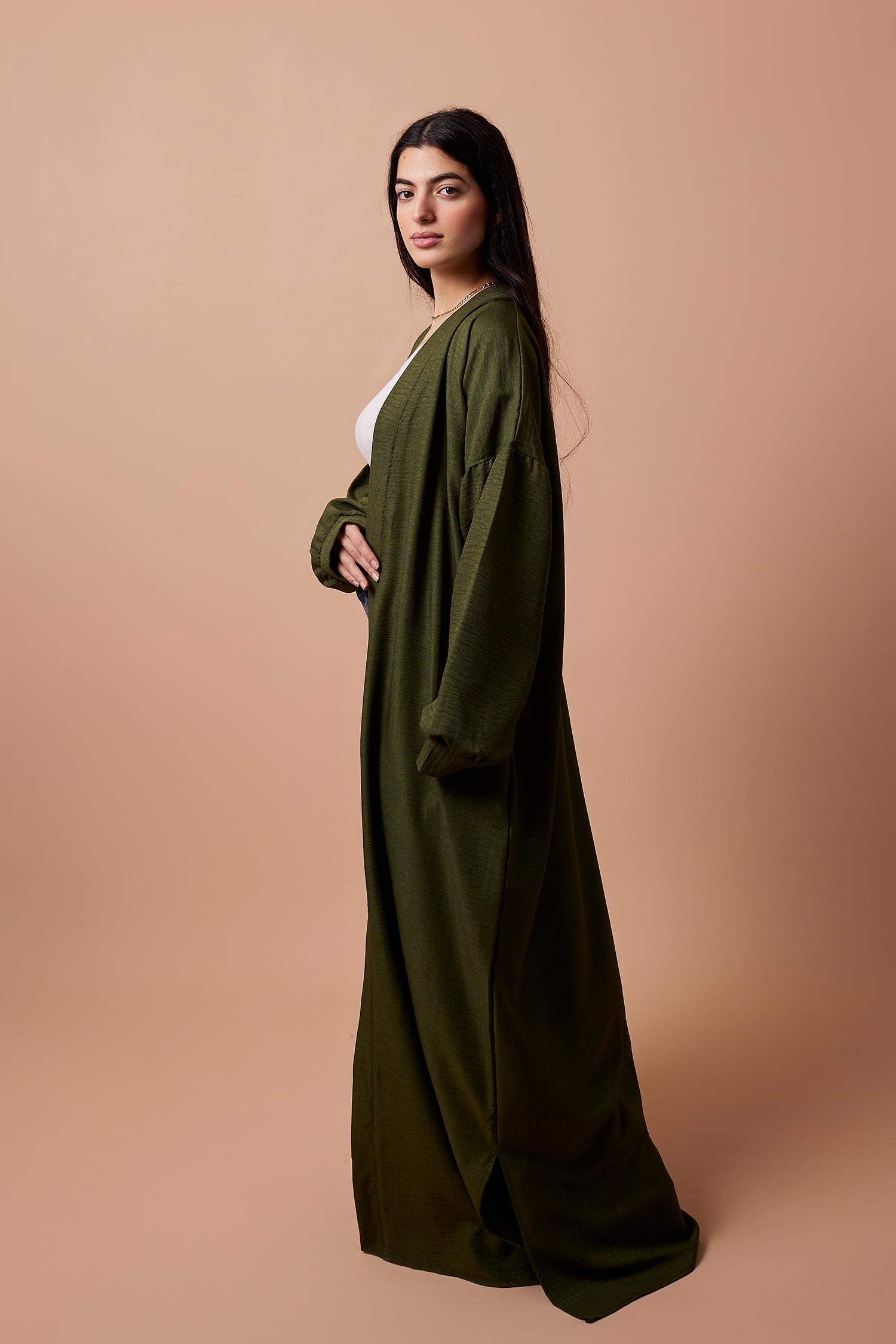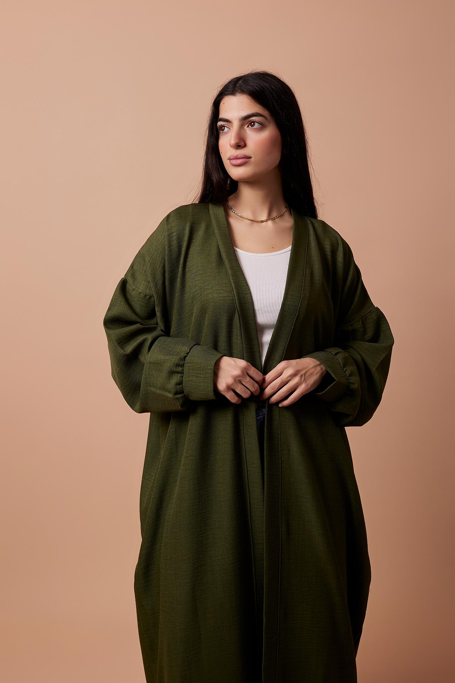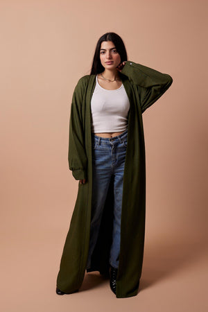 Long Puff-Sleeve Cardigan with Belt & Pockets - Olive