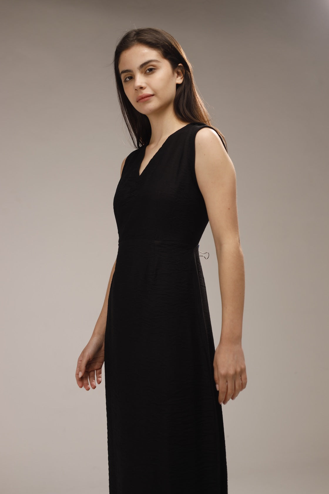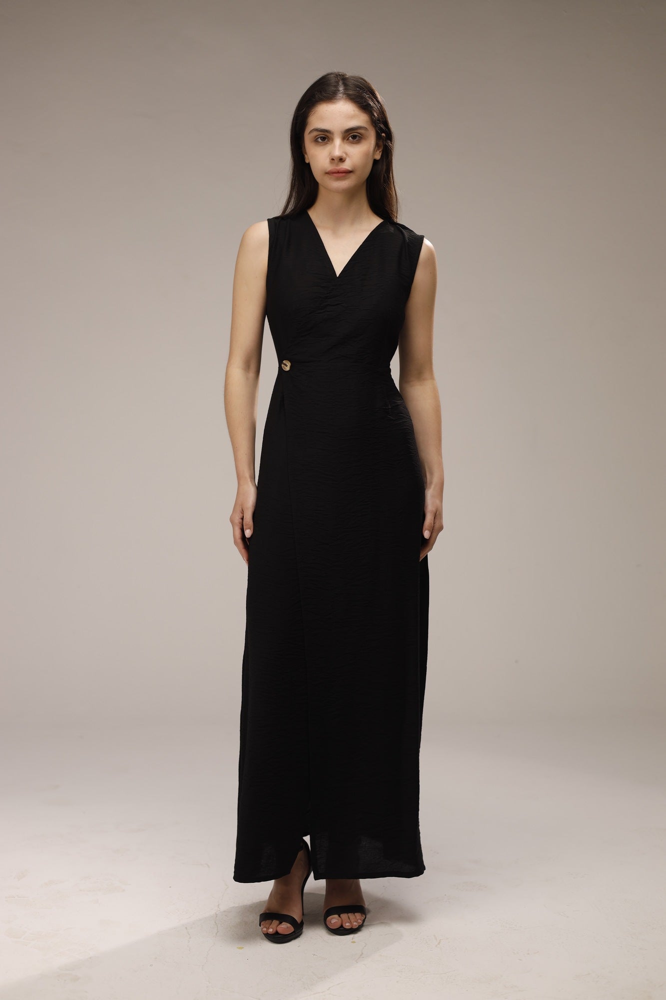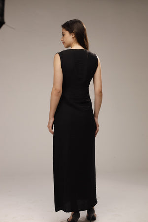 Style Variations: Sleeveless, elegant drape with slit for movement