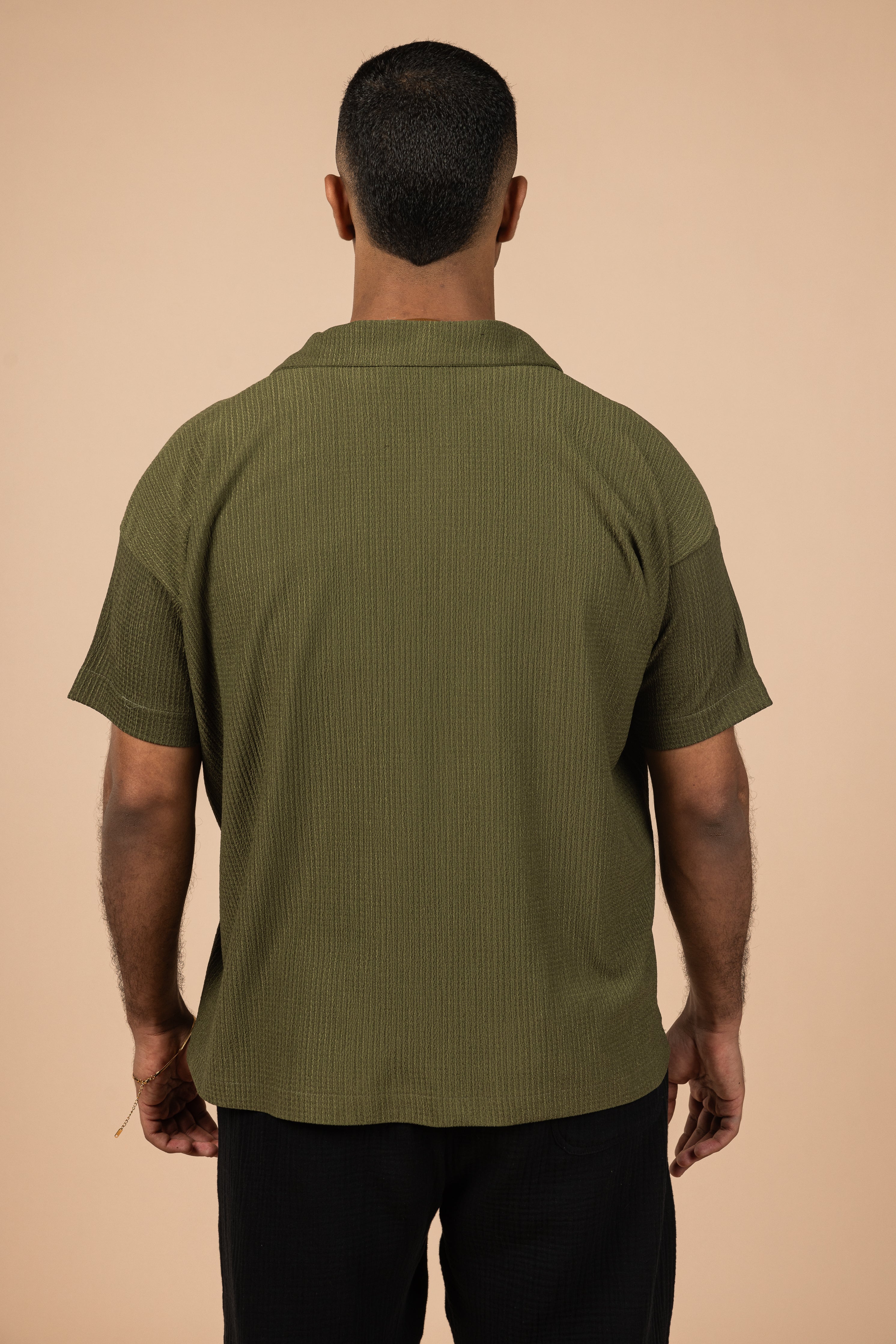 Cotton Moon Crushed Boxy Fit Polo Shirt - Olive Green