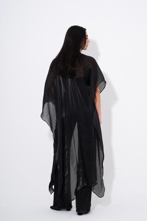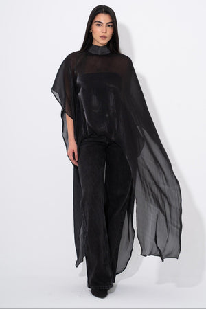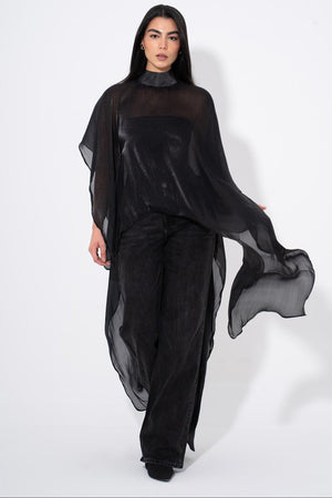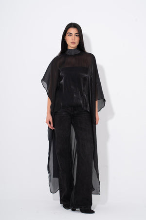 Flowing and effortlessly elegant, this sheer poncho top is a statement piece that brings fluidity and grace to your look. Crafted from lightweight, high-quality fabric, it drapes beautifully over any outfit. Whether paired with denim for a casual chic style or dressed up for an evening out, this piece is both modern and timeless. Perfect for elevating your wardrobe with a touch of sophistication.