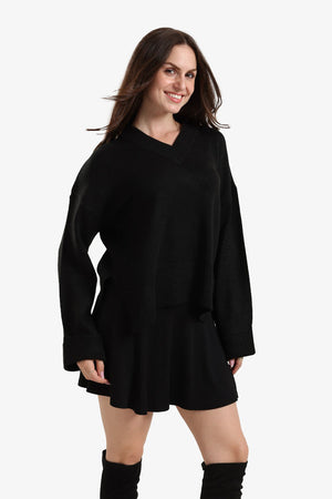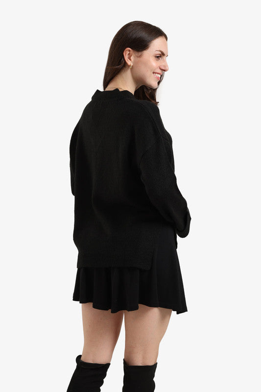 Plain High-Low Folded Hem Wool Pullover – Black