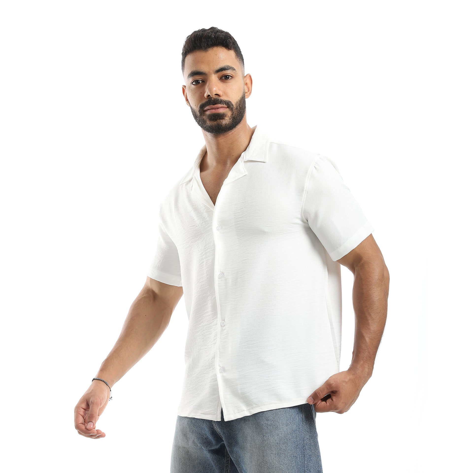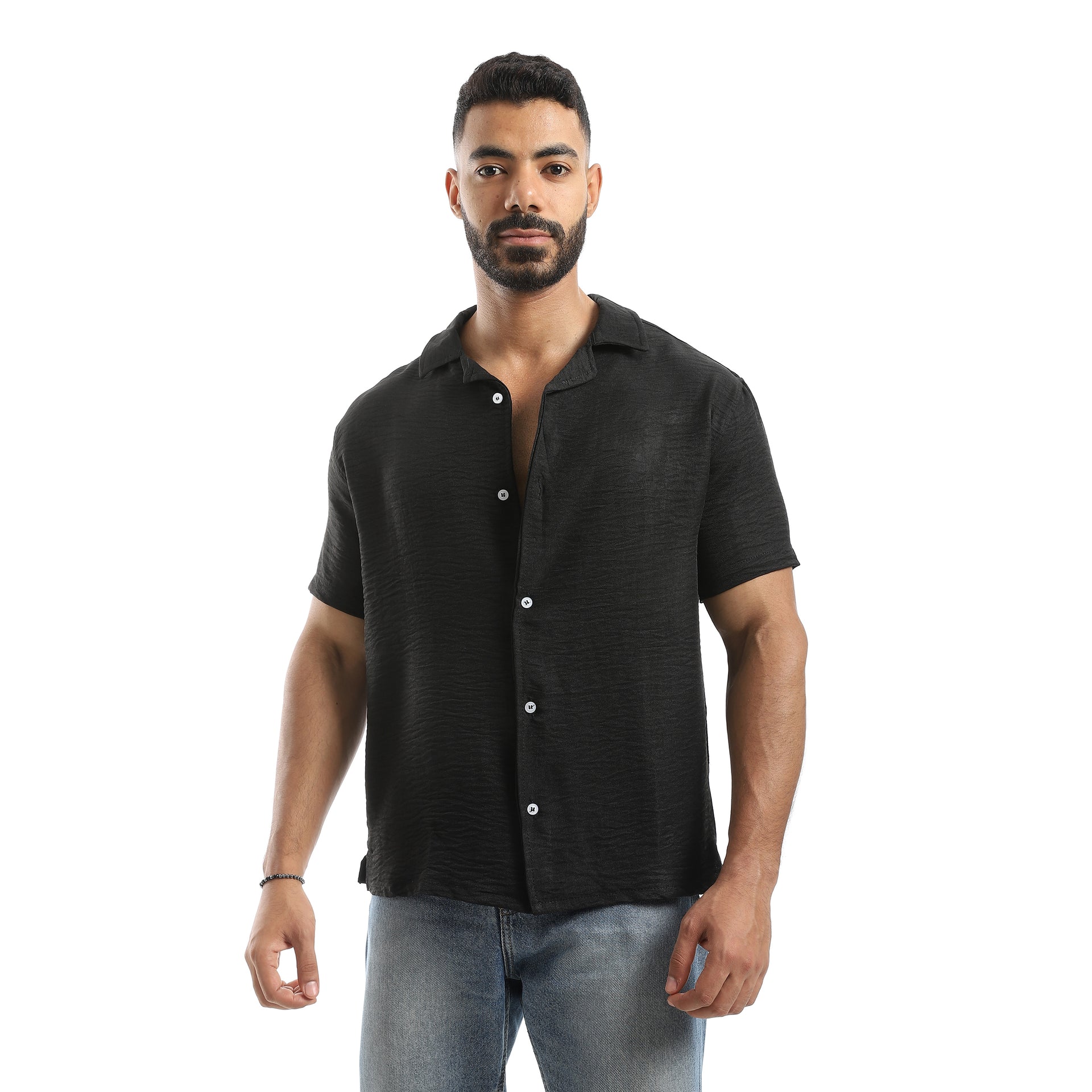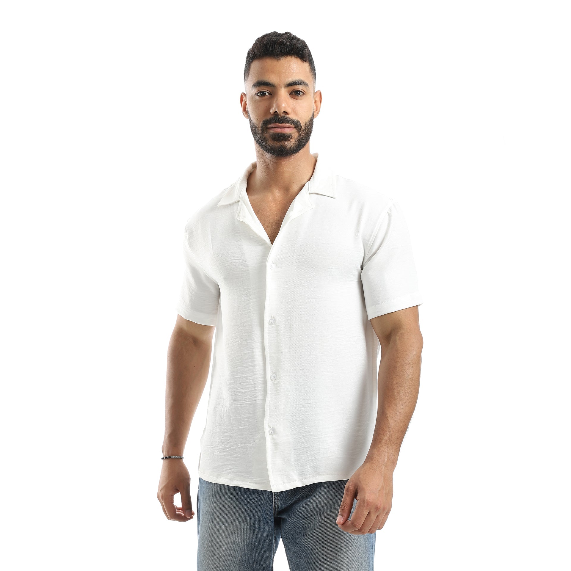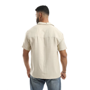 Half Sleeves Turned Down Collar Plain Button Closure Shirt