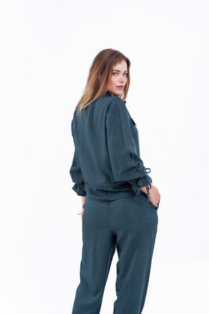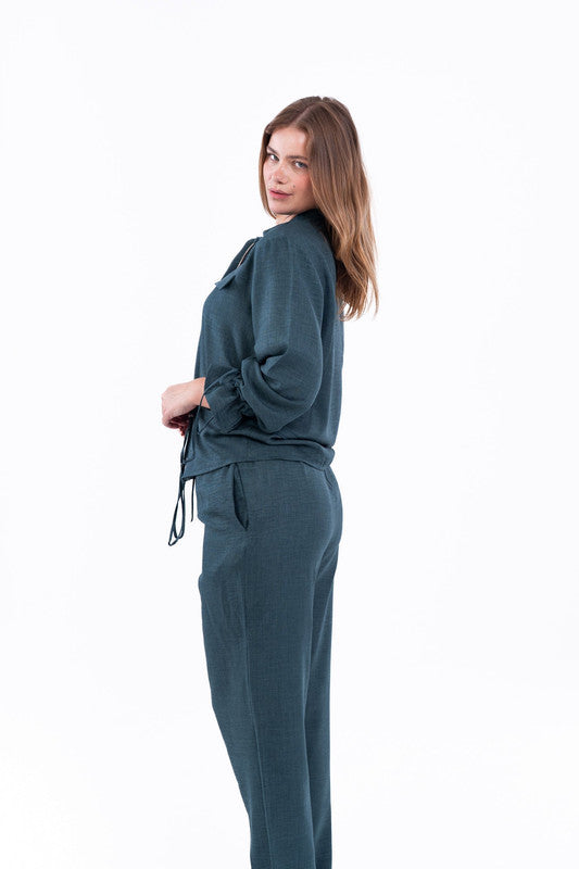 - Details & Trims: Two front chest pockets, adjustable waist tie for a custom fit