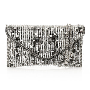 - Hardware / Details: All-over pearl and rhinestone embellishment with metallic hardware accents