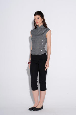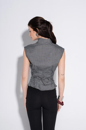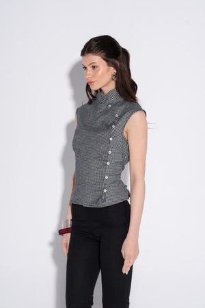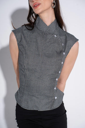 This top is a stunning masterclass in architectural tailoring, blending the timeless elegance of a Mandarin collar with a sharp, modern asymmetric design. The micro-gingham pattern in monochrome creates a textured, sophisticated look that transitions perfectly from a creative workspace to an upscale evening event