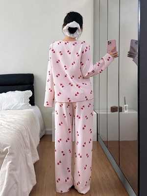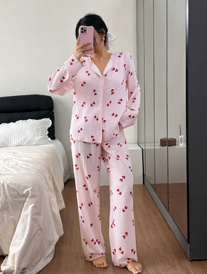 SHEIN Women's Casual Cute Contrast Color Collar Striped Heart Print Long Sleeve Top & Pants Pajama Set Cute Pajamas For Woman, Fall & Winter Clothes