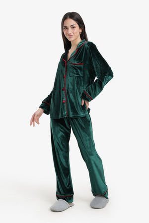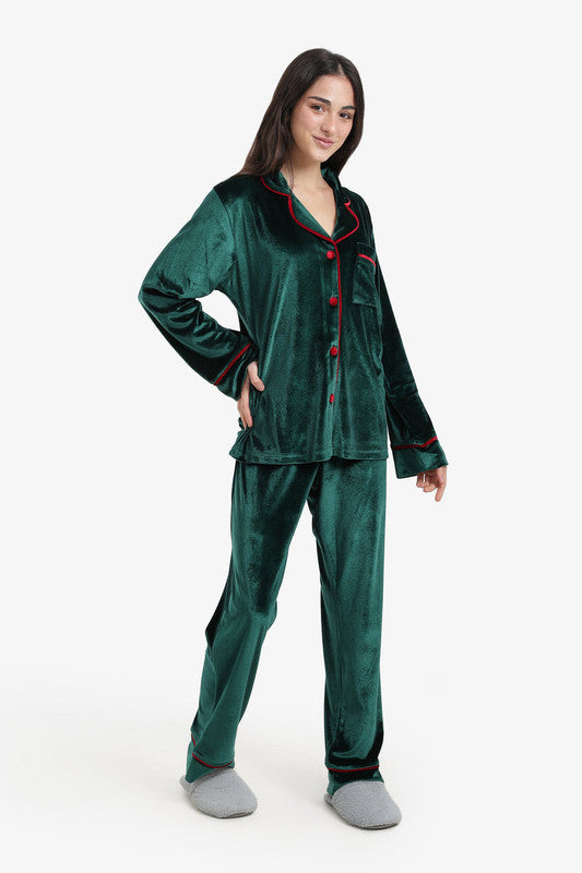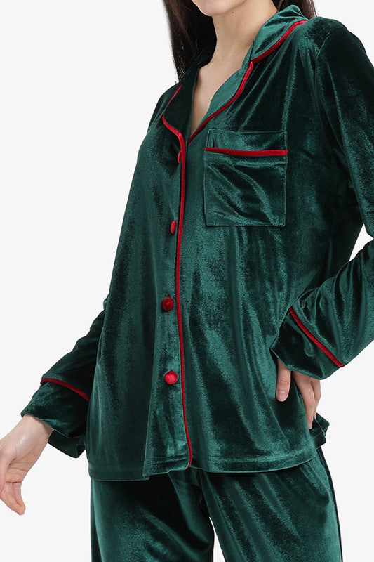 Solid Contrast-Piping Velvet Pajama Set – Olive Green