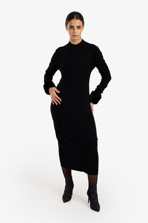 Solid Fur Cuff Slim Fit Knit Dress – Black