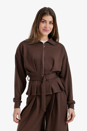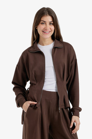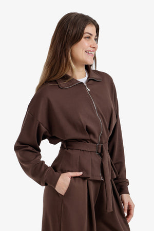 Solid Zip-Up Belted Lounge Jacket – Dark Brown