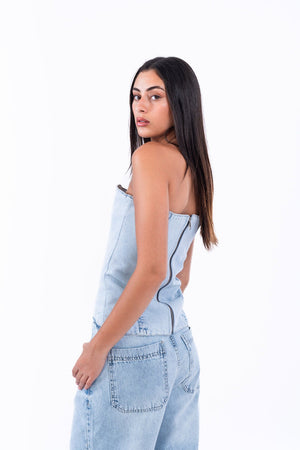 Strapless Zip-Back Denim Crop Top – Light Blue
