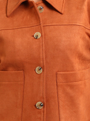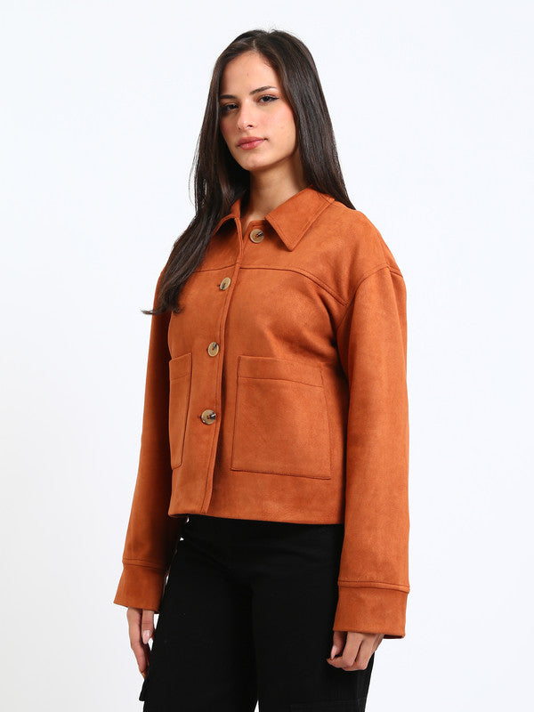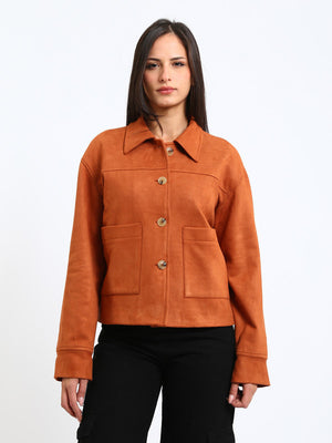 - Details: Smooth suede feel with structured stitching and oversized buttons