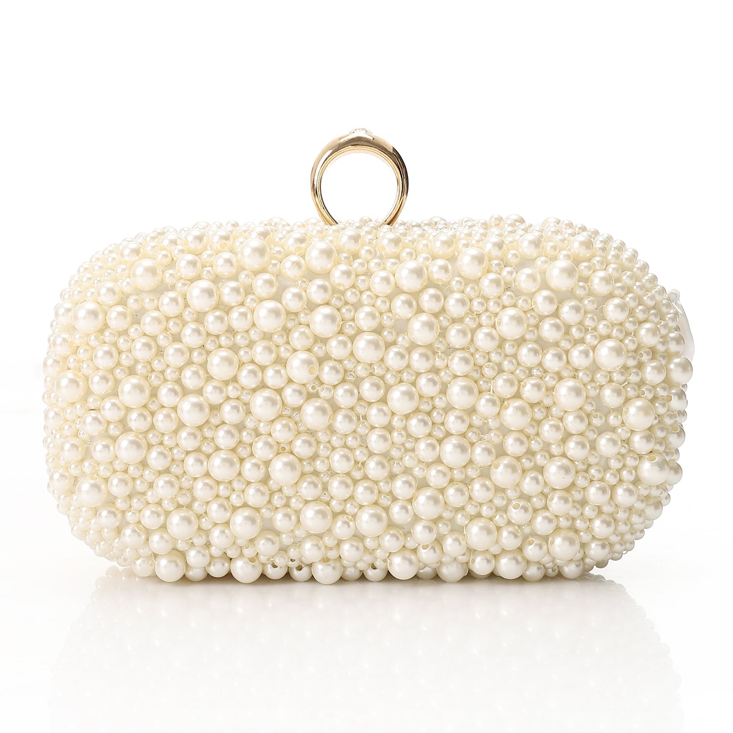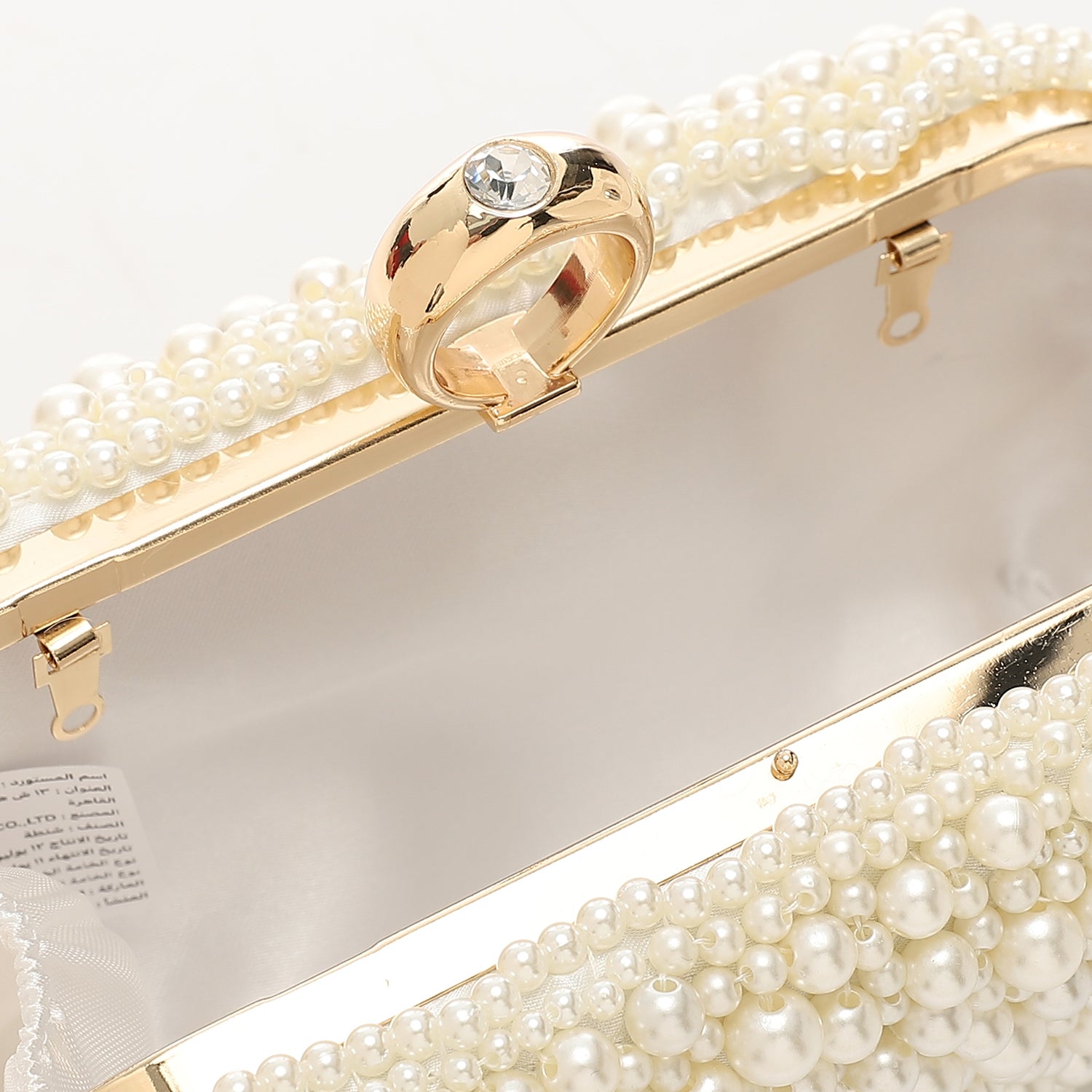 - Hardware / Details: Gold-tone metal frame with pearl and crystal embellishment