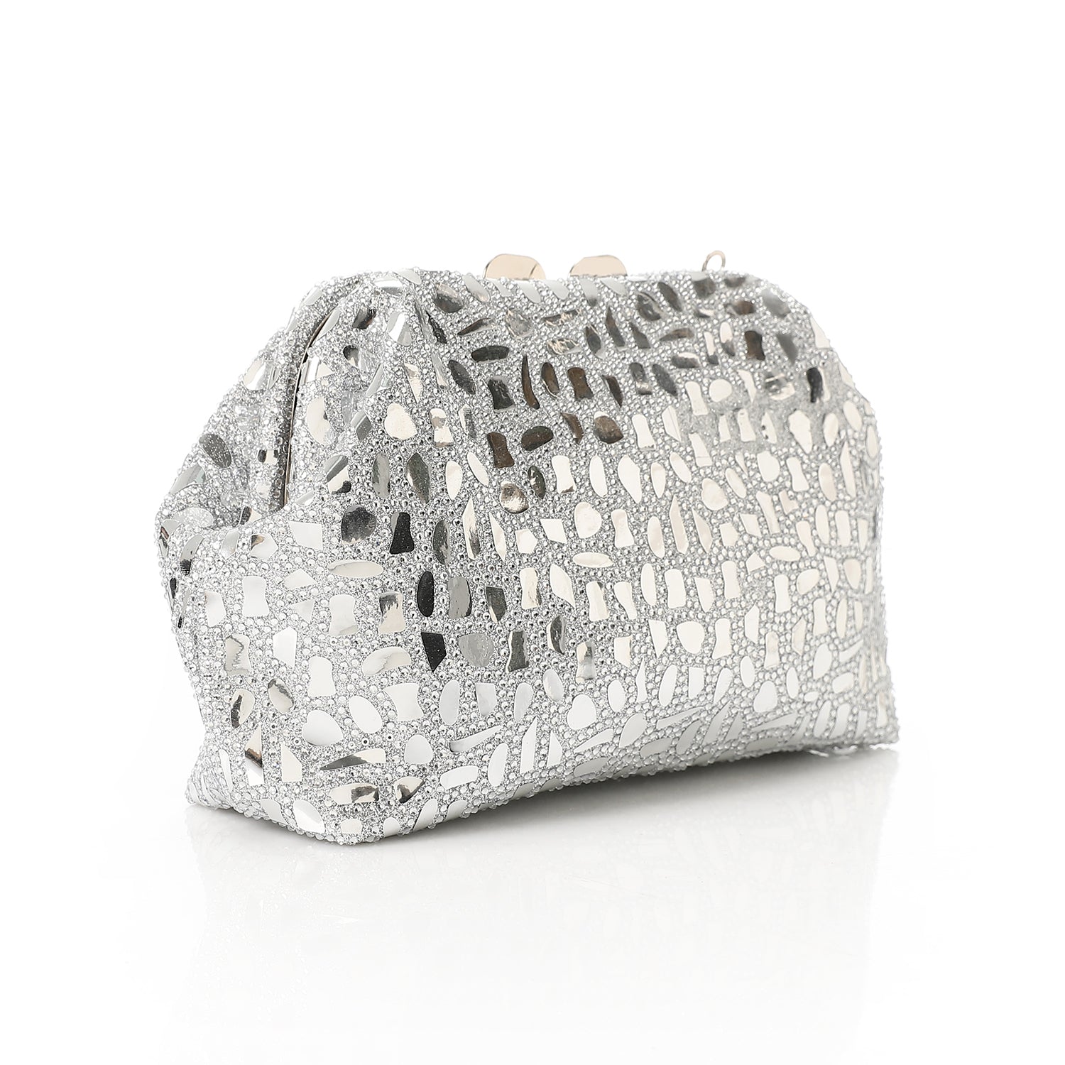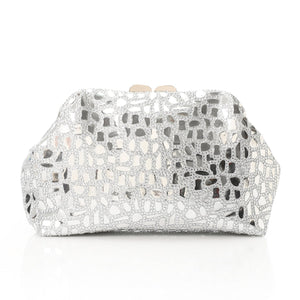 - Type / Style: Structured evening clutch with a bold reflective design