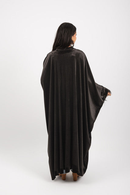 - Feather-trimmed cuffs add a dramatic, high-fashion flair to every movement, while rich, heavy-weight velvet drapes beautifully with a luxuriously soft touch; designed in a modern bisht silhouette with an oversized, effortless fit, available in timeless Midnight Black or bold Royal Berry for a statement of pure luxury.