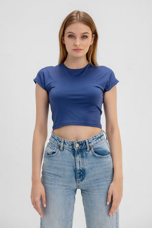 Cotton Cropped Round Neck Top Cap Sleeve - Navy