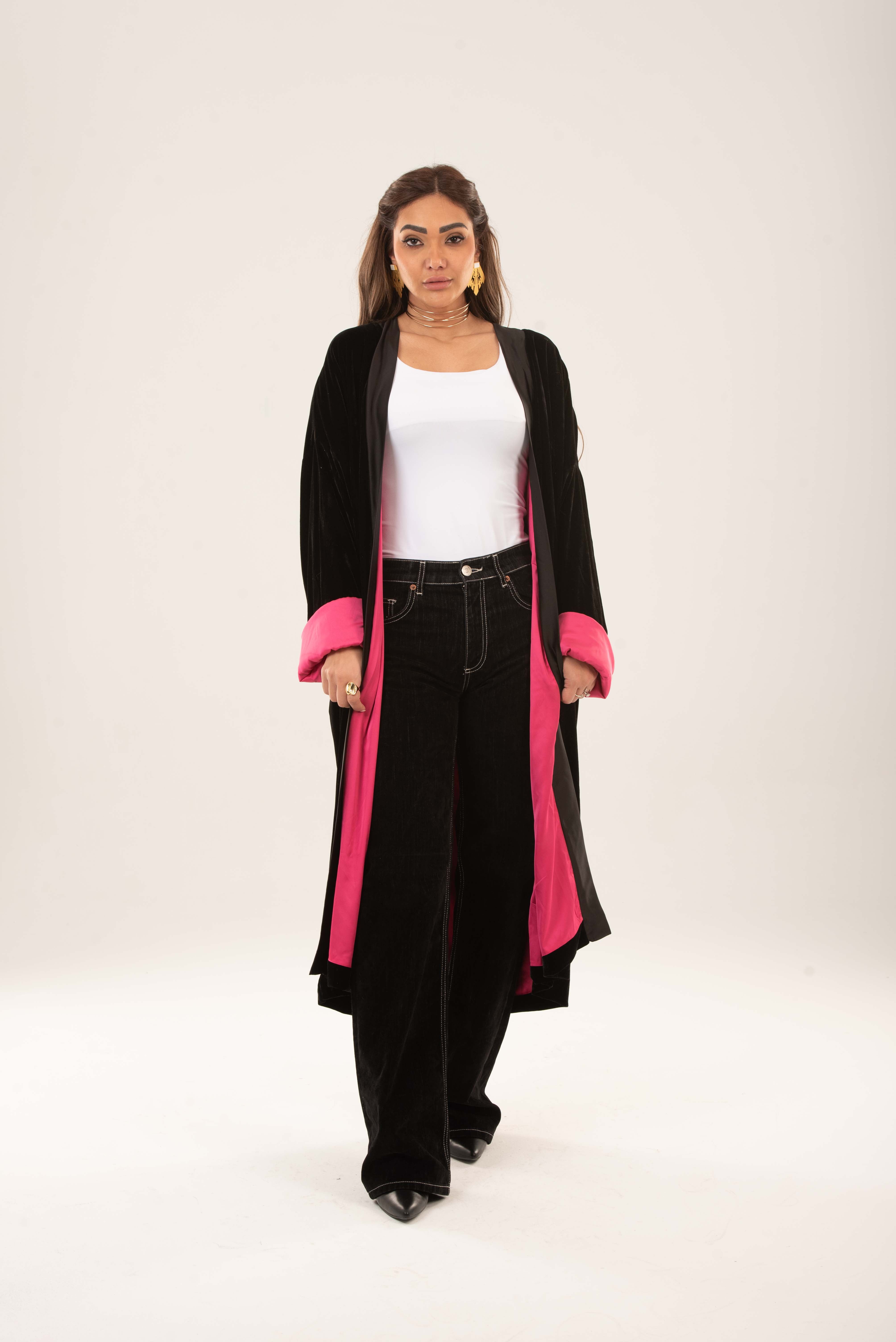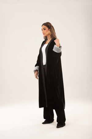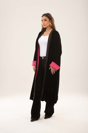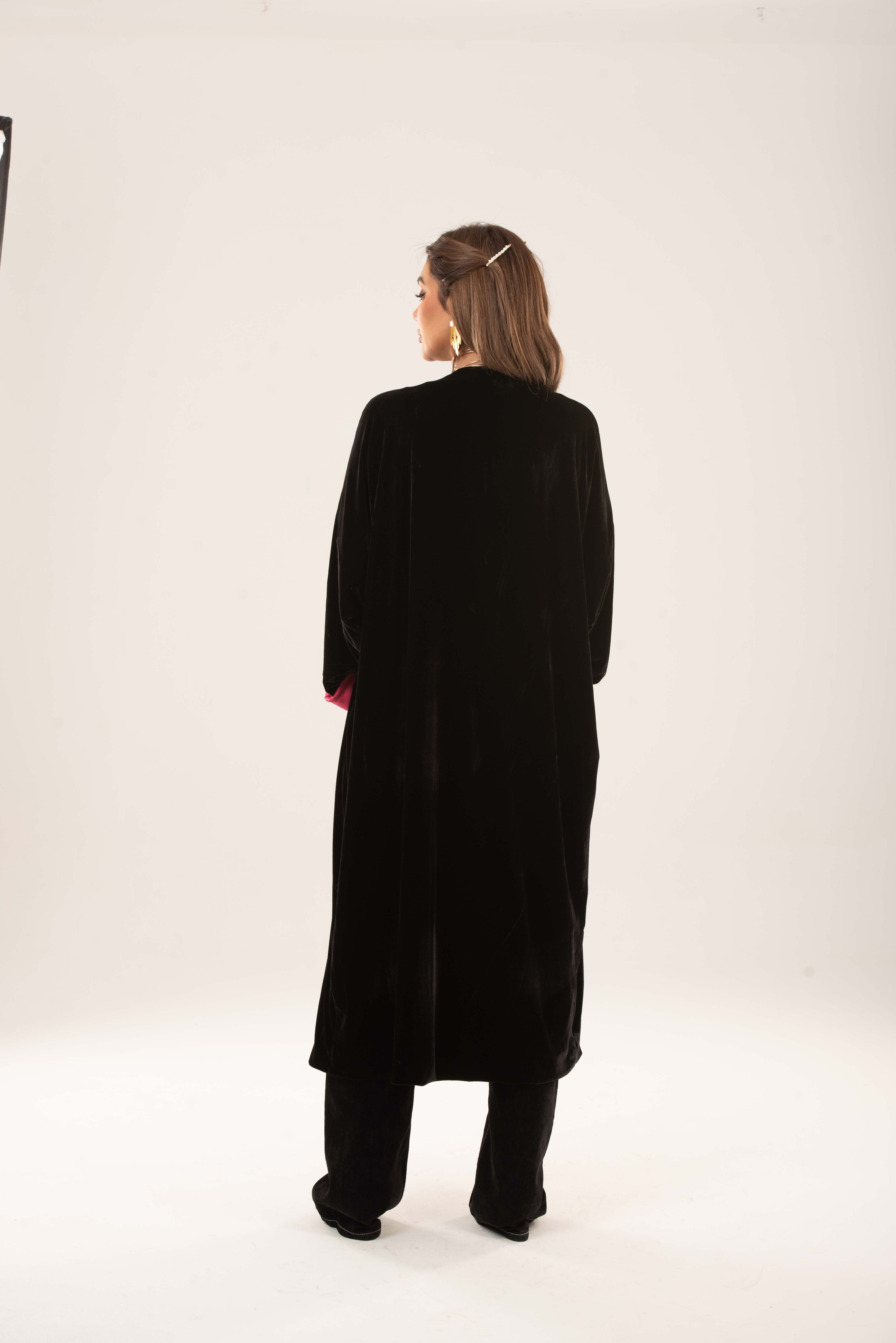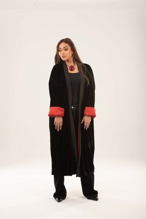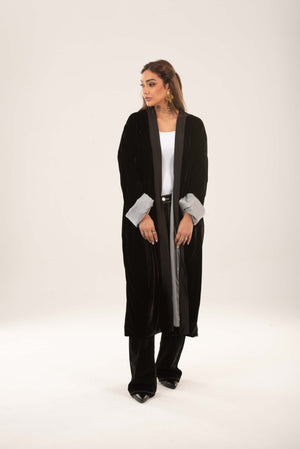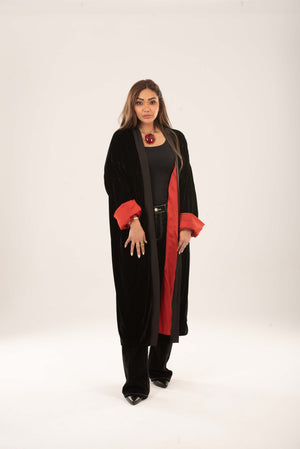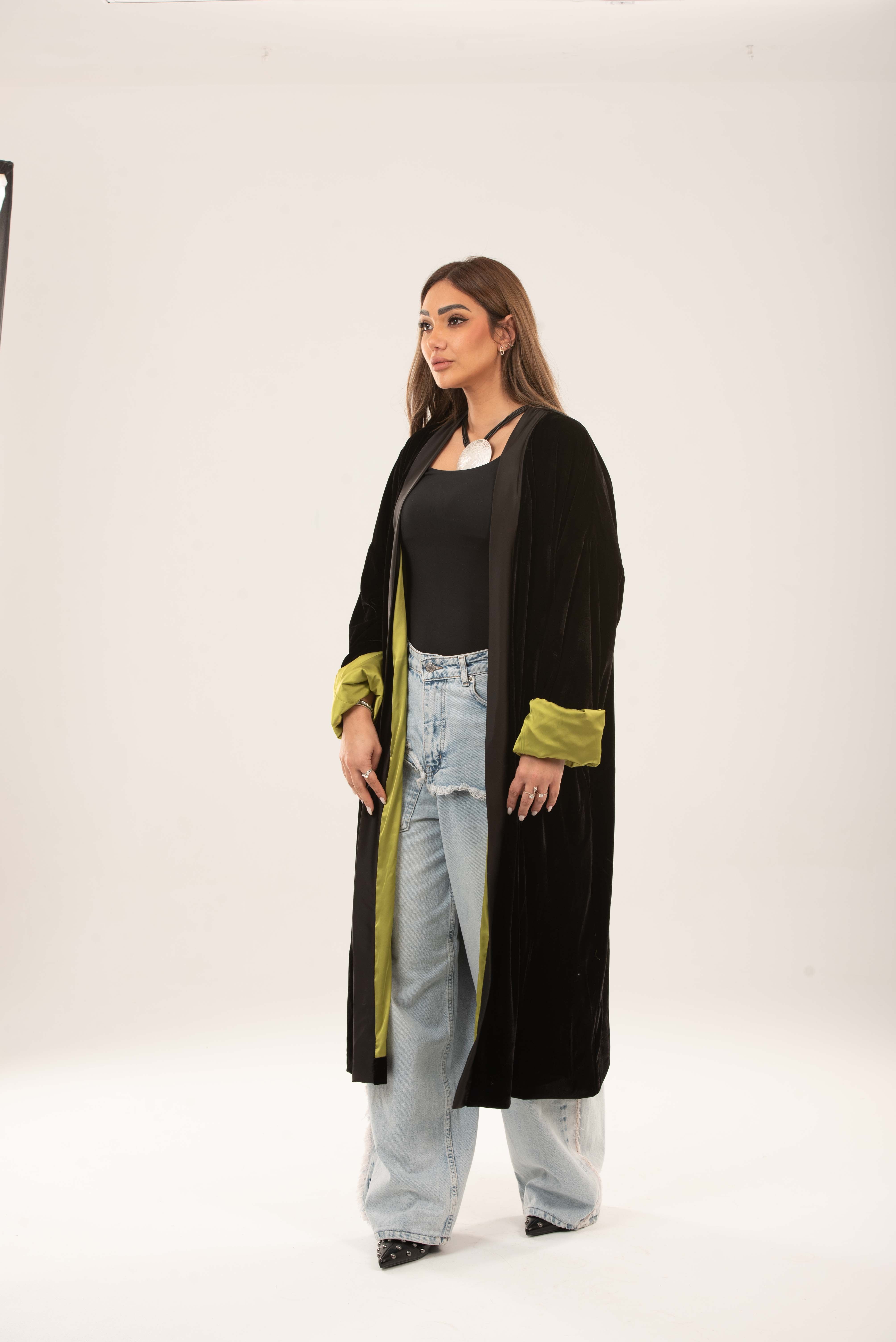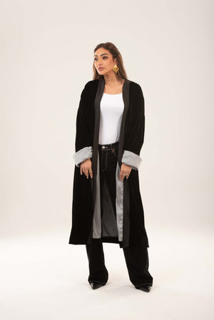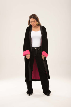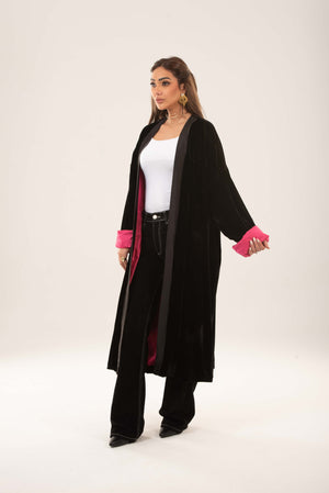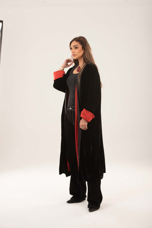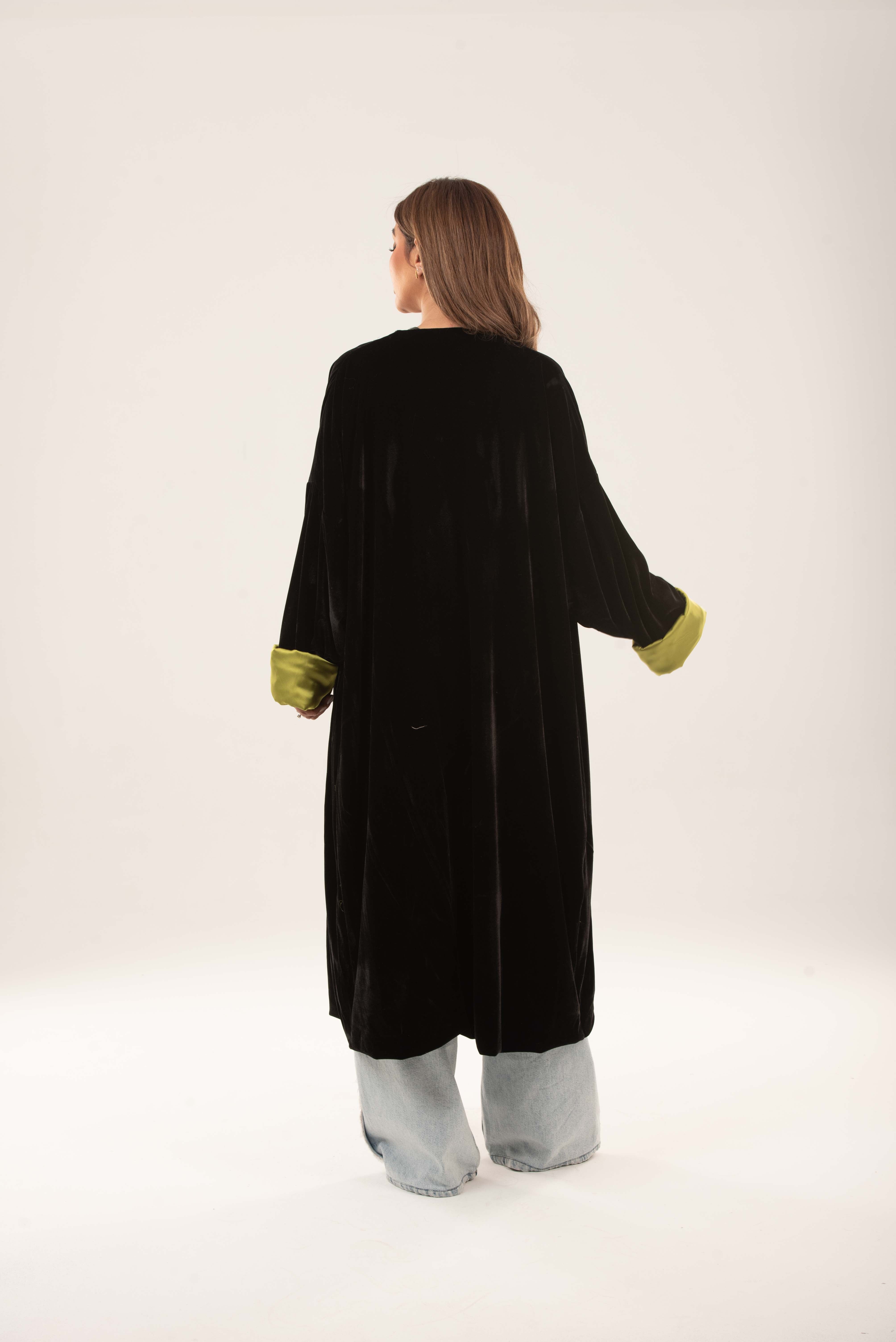 Features: Contrasting satin cuffs and inner lining, fluid drape