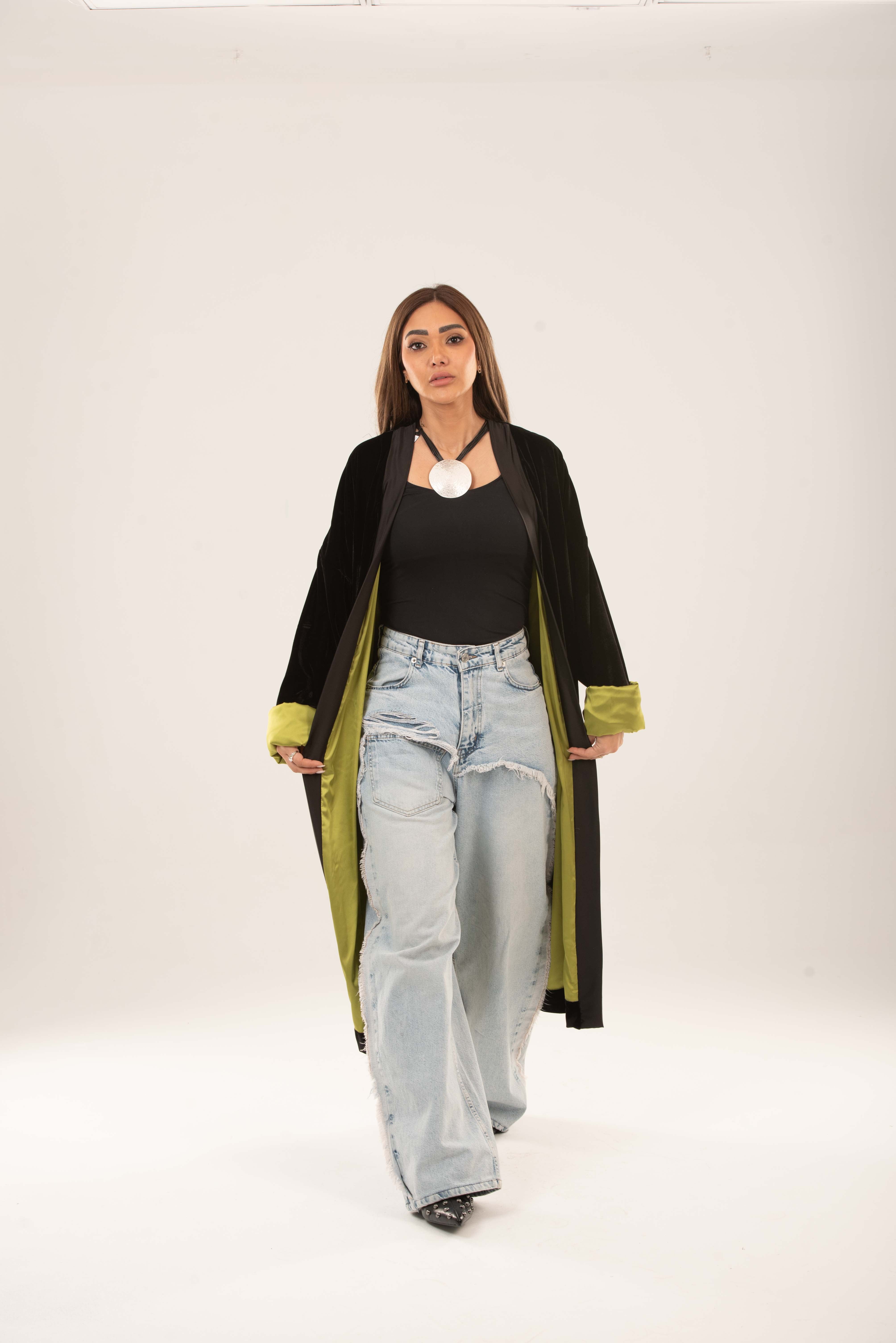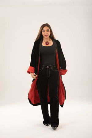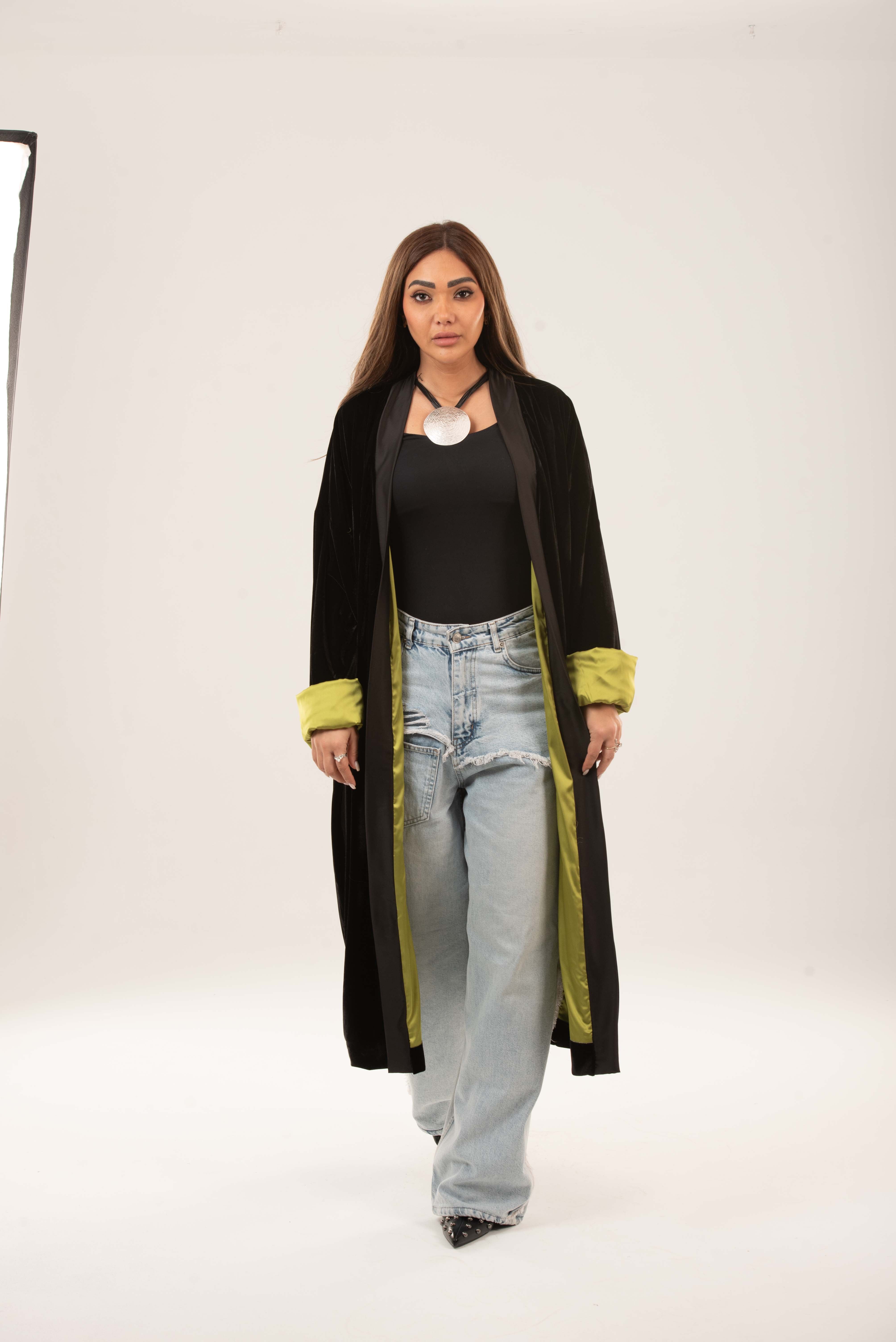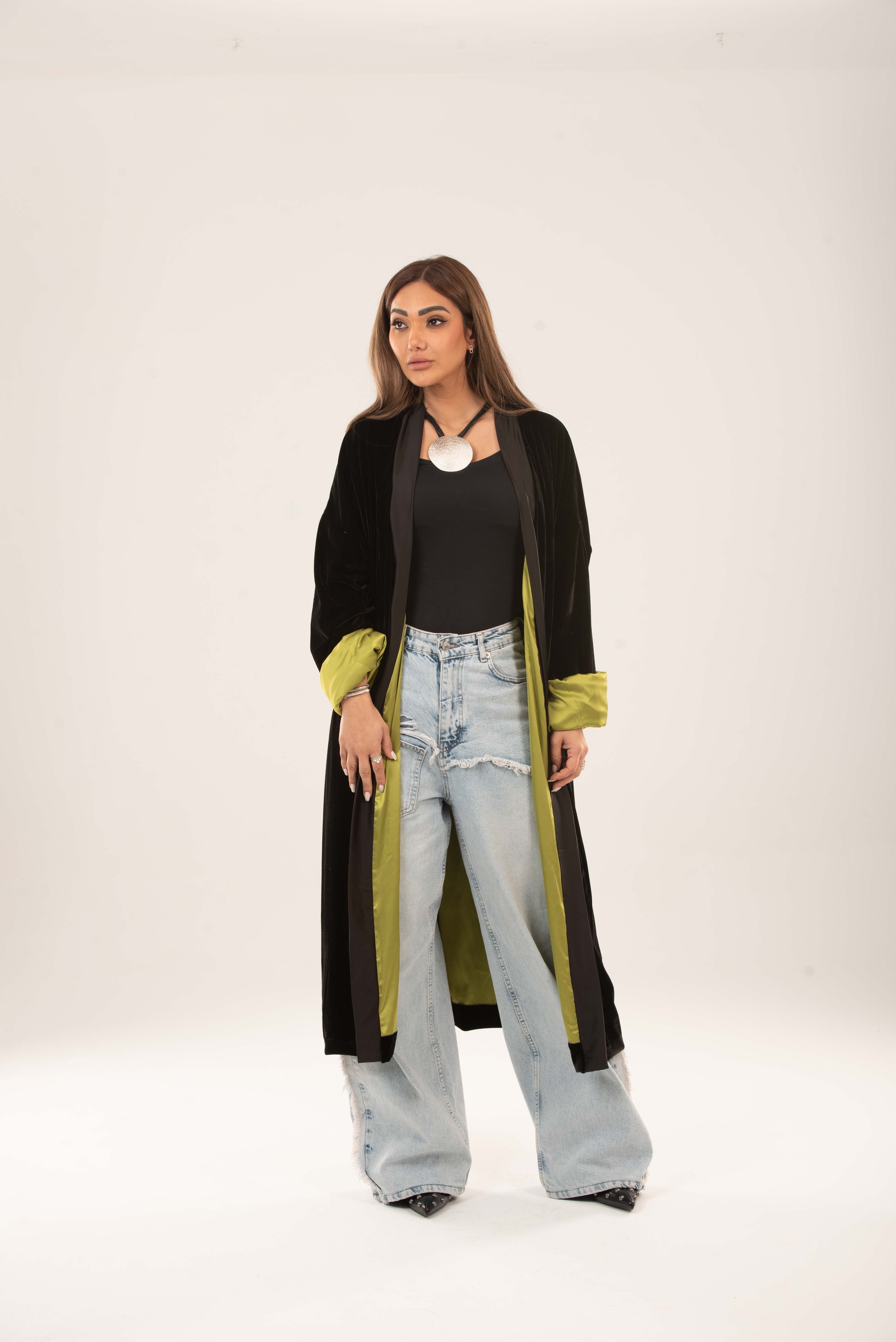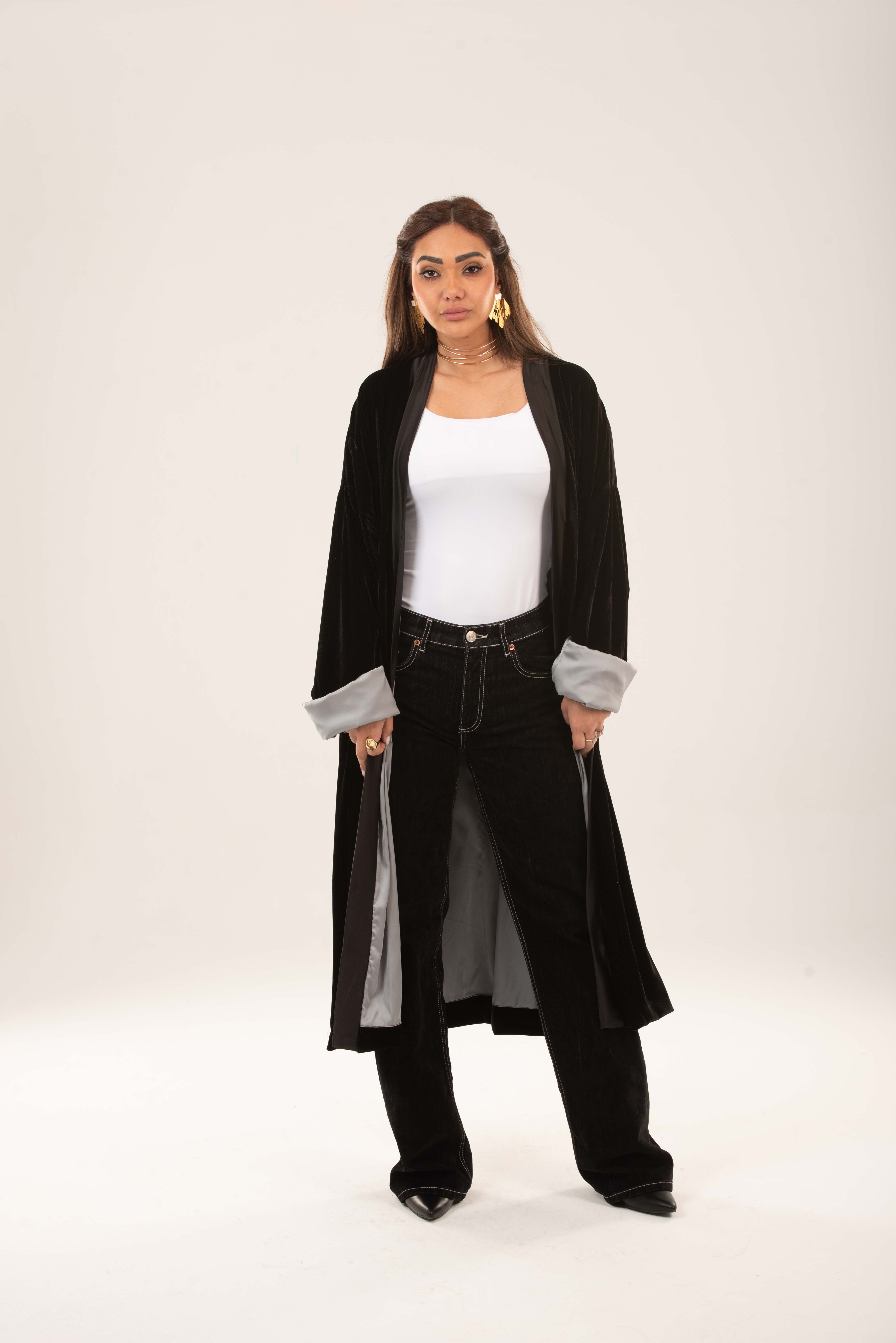 Features: Contrasting satin cuffs and inner lining, fluid drape
