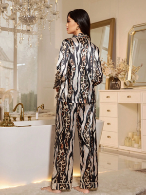 LuxeNights Elegant Leopard Print Satin Pocket Front Button Long Sleeve Pajama Set For Women Curve Pajamas Set 2 Pieces Lounge Set Woman Animal Print Pajama Set Two Pieces Sleepwear Set, Fall & Winter Clothes