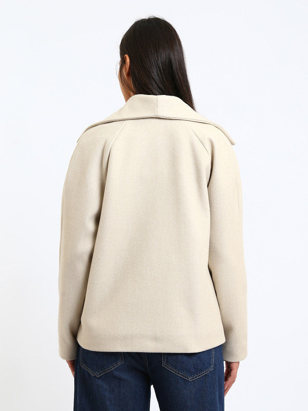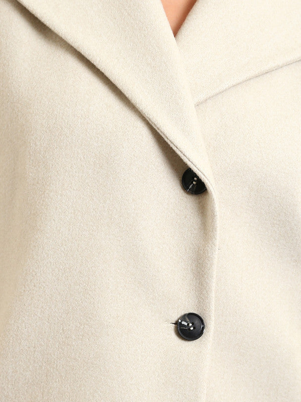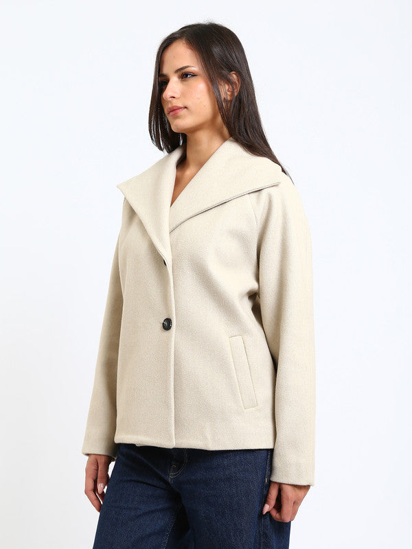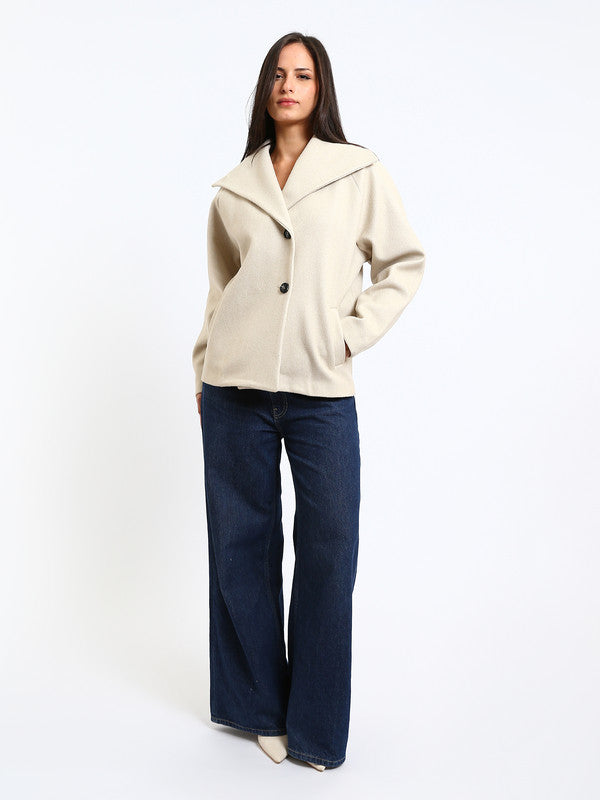 - Collar: Wide asymmetric lapel collar for a modern tailored look