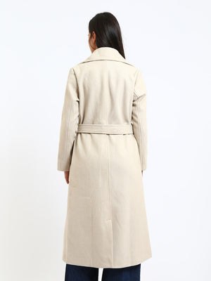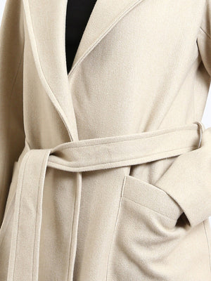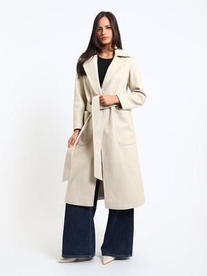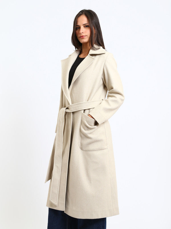 Wool Blend Felt Plain Belted Long Coat – Greige